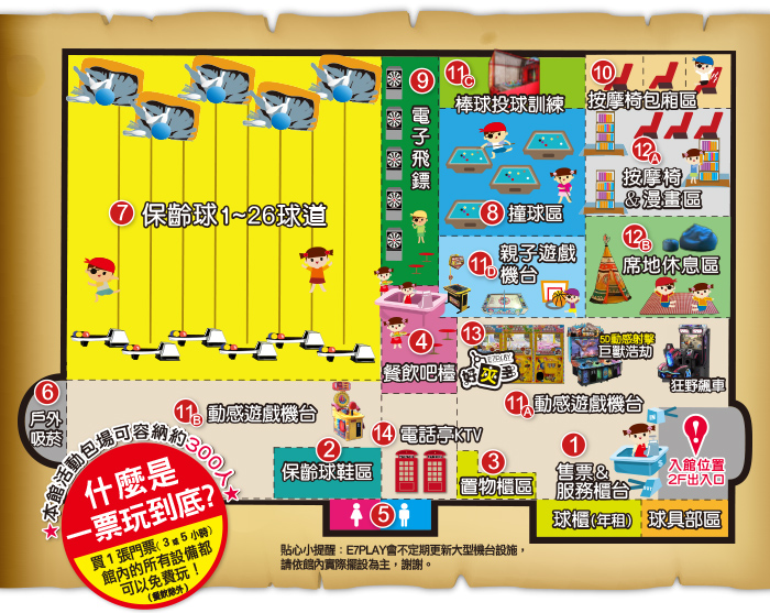 本店設施更新週期為每季一次:每年1月、4月、7月、9月於官網同步更新相關資訊。如有臨時異動或故障維修之情況,仍依館內實際擺設機台為準,敬請見諒!建議您如有專程非玩不可的設備,請務必於前往遊玩前,事先致電各館洽詢特定設備的狀況喔!