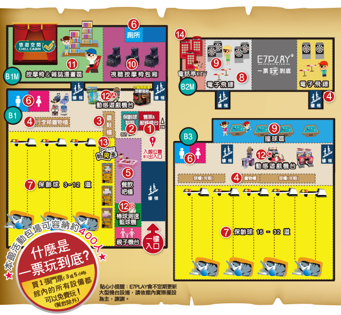 本店設施更新週期為每季一次:每年1月、4月、7月、9月於官網同步更新相關資訊。如有臨時異動或故障維修之情況,仍依館內實際擺設機台為準,敬請見諒!建議您如有專程非玩不可的設備,請務必於前往遊玩前,事先致電各館洽詢特定設備的狀況喔!