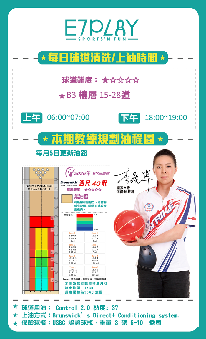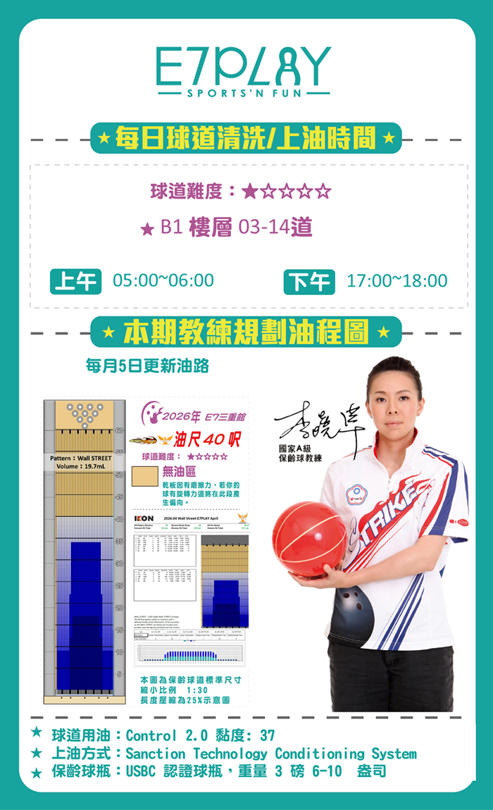 【三重店】2026年04月份「每日球道清洗/上油時間」及「油程圖」如下,請您參考!