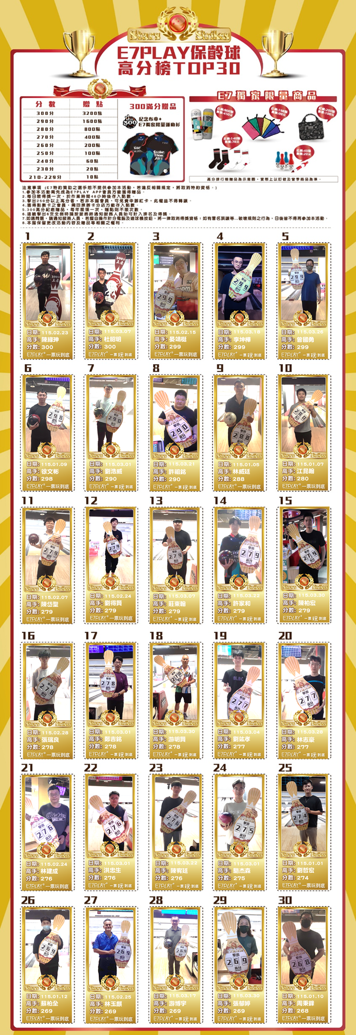 隱藏民間的保齡球高手,不時出沒在你的身邊,記得幫他們加加油喔! 凡擊出230以上高分,即可獲得E7卡的紅利點數!歡迎各路好手一起來E7挑戰~~~~