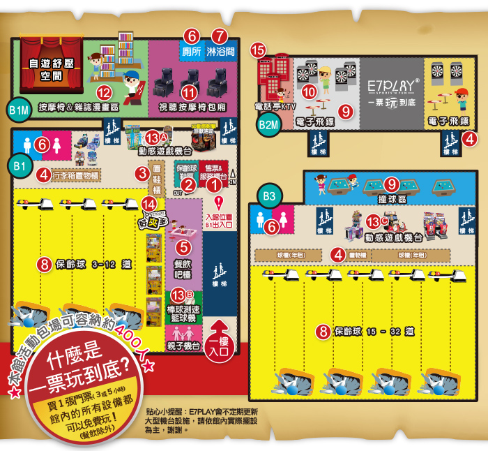 本店設施更新週期為每季一次:每年1月、4月、7月、9月於官網同步更新相關資訊。如有臨時異動或故障維修之情況,仍依館內實際擺設機台為準,敬請見諒!建議您如有專程非玩不可的設備,請務必於前往遊玩前,事先致電各館洽詢特定設備的狀況喔!