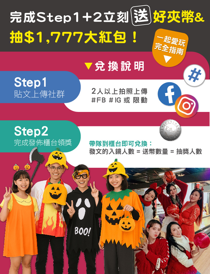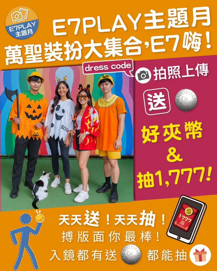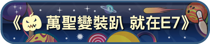 ➤ 搞怪萬聖派對,就在E7!萬聖夜變裝大集合~揪 2 人以上穿同風格,在館內拍出有趣合照,上傳就能直接換好夾幣! |