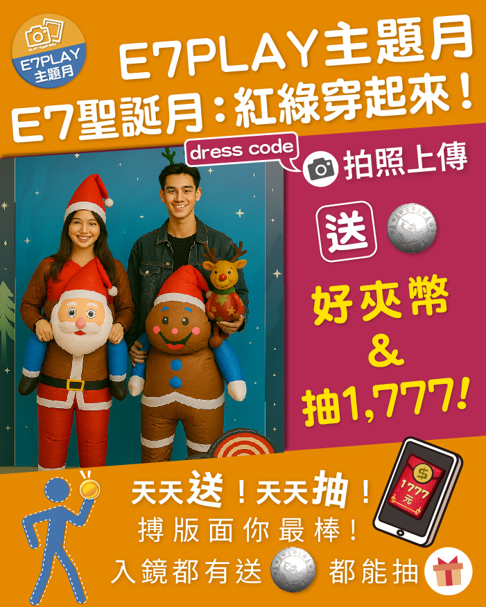 除了現場立刻領好夾幣、抽1,777大紅包→裝扮照PO文太吸睛,可能會被E7海巡小編看上,加碼再給獎!