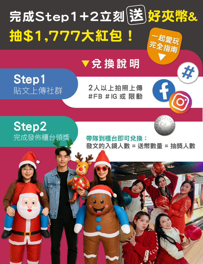 ➤ 聖誕派對開趴啦!氣氛全開就在E7!紅綠裝扮穿過來~揪 2 人以上穿同風格,在館內拍出有趣合照,上傳就能直接換好夾幣! |