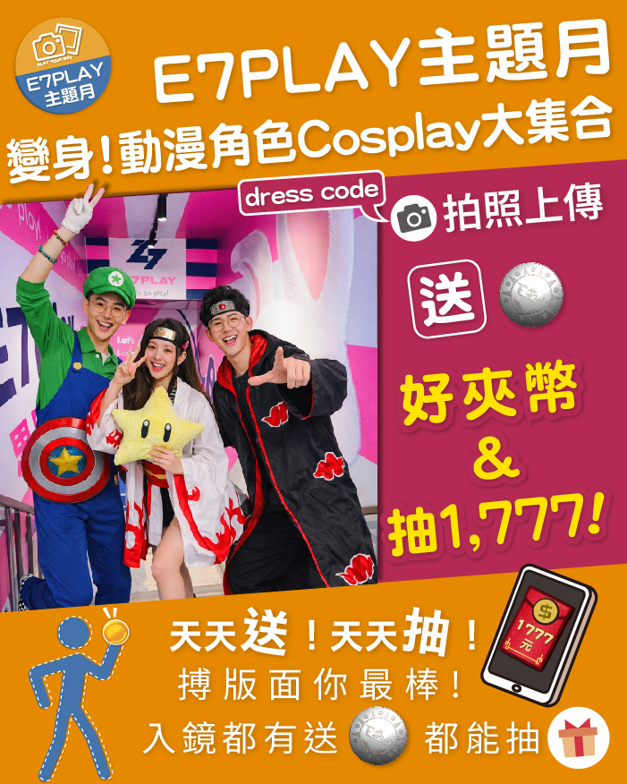 ![]() 帶有dresscode主題穿搭到館 #最玩星 ➤ 2 人以上穿同一主題(不限風格)穿搭,拍出創意合照上傳到社群,立即兌換好夾幣,遊戲樂趣雙重滿分! |