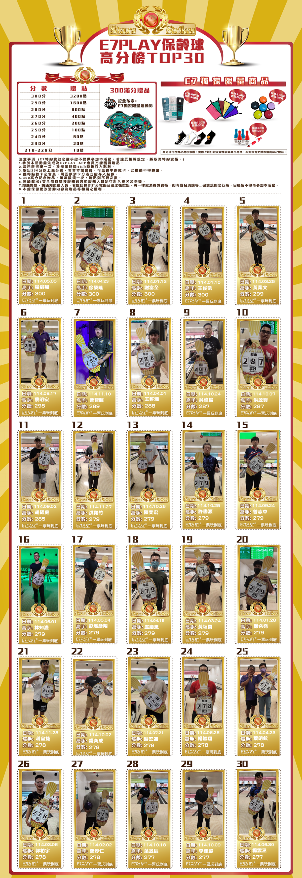 隱藏民間的保齡球高手,不時出沒在你的身邊,記得幫他們加加油喔! 凡擊出230以上高分,即可獲得E7卡的紅利點數!歡迎各路好手一起來E7挑戰~~~~