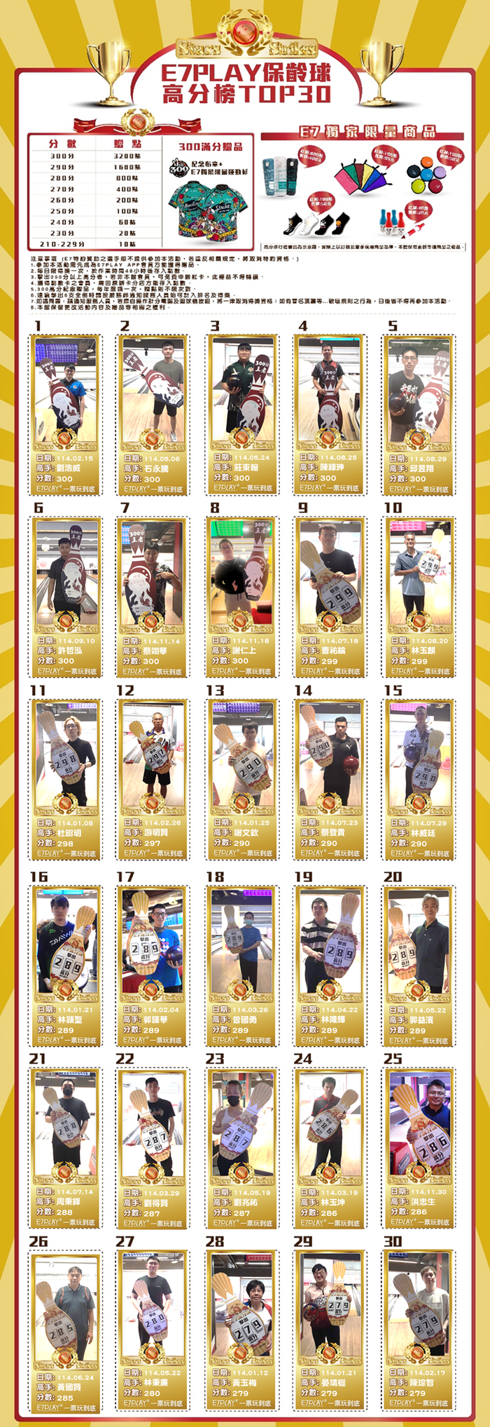 隱藏民間的保齡球高手,不時出沒在你的身邊,記得幫他們加加油喔! 凡擊出230以上高分,即可獲得E7卡的紅利點數!歡迎各路好手一起來E7挑戰~~~~